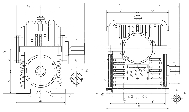 整體式PWU80、PWU100、PWU125、PWU140、PWU160、PWU180、PWU200、PWU225、PWU250、PWU280、PWU315、PWU355、型平面二次包絡(luò)環(huán)面蝸桿減速機主要尺寸(GB/T16449-1996)