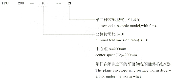 該減速器系列有四種型式:TPG、TPU、TPA、TPS.其中:TP-平面包絡(luò)環(huán)面蝸桿組合為