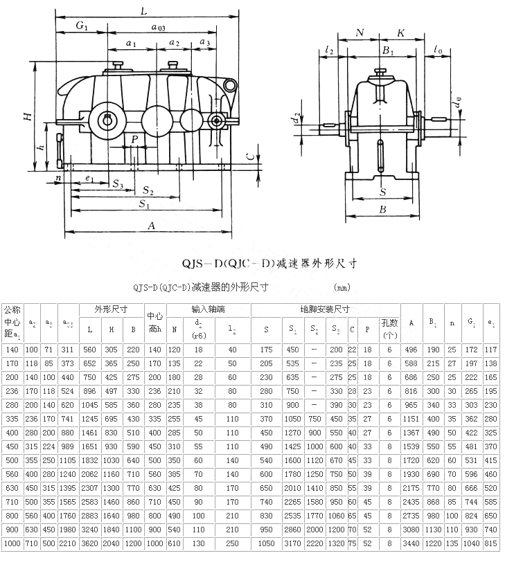 1)結(jié)構(gòu)型式 QJ-D型減速器分為:QJR-D(QJB-D)型為二級(jí),QJS-D(QJC-D)型為三級(jí)。QJRS-D(QJD-D)型為二級(jí)安裝尺寸三級(jí)速比。