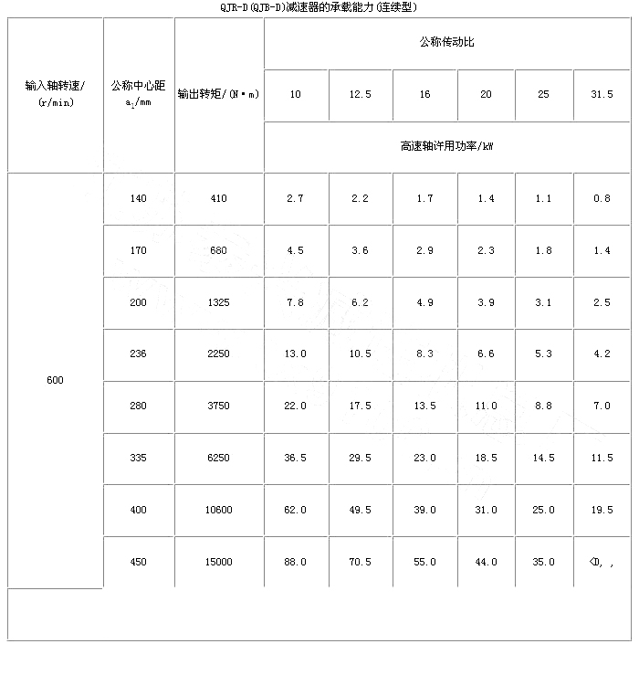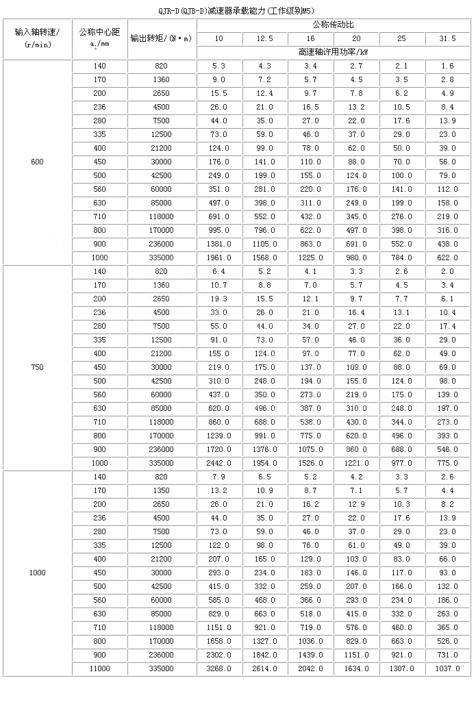 起重機(jī)底座式減速器是在三支點(diǎn)減速器的基礎(chǔ)上派生出來(lái)的。因此QJ-D型減速器的工作條件、主要技術(shù)參數(shù)、承載能力和輸出軸端最大允許徑向載荷與三支點(diǎn)減速器相同,其它有所不同。