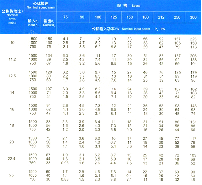 212、250、300九種規(guī)格。每一規(guī)格的傳動比有10、11.2、12.5、14、16、18、20、22.4、25九種。