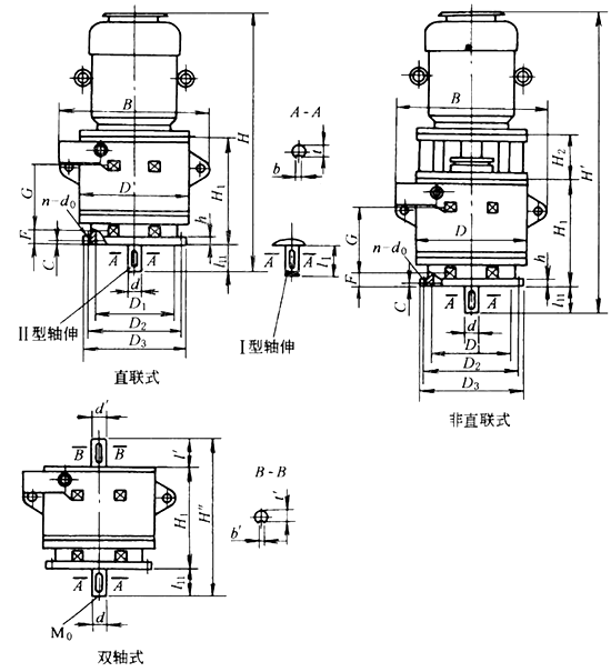 該系列減速器有直聯(lián)式、非直聯(lián)式、雙軸式三種,輸出軸有兩種結(jié)構(gòu)型式:Ⅰ型為夾殼式;Ⅱ型為普通圓柱形軸伸,電動機安裝型式為B5或V1。雙軸式不帶電機,輸入功率應(yīng)根據(jù)潤滑以提高傳動效率;增設(shè)密封裝置,提高密封性能杜絕漏油現(xiàn)象,改進后的機體高度、安裝尺寸及參數(shù)均不變。