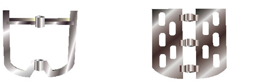 此類攪拌器為慢速型攪拌器,適用于中高粘度液體的混和、傳熱反應(yīng)等過程。μ<105cP,轉(zhuǎn)速n=1-100rpm。錨框式(MKS)低速旋轉(zhuǎn)時(shí)沿壁面能得到大的剪切力,可防止沉降及壁面附著,底部形狀貼合橢圓形罐與中間的底軸承。錨帶式(MDS)是螺帶和框式的組合,結(jié)合了螺帶式和框式攪拌器的作用。方框式(FKS)、方柵式(FSS)形狀簡(jiǎn)單制作容易,效能同框式,中等粘度的混合,深解更適合些。板框式(BKS)是另一種簡(jiǎn)易的慢速攪拌器,板框上開的孔,其形狀數(shù)量,分布型式,都可以因需要而變化。
