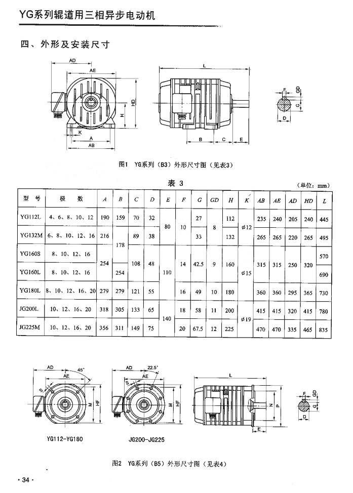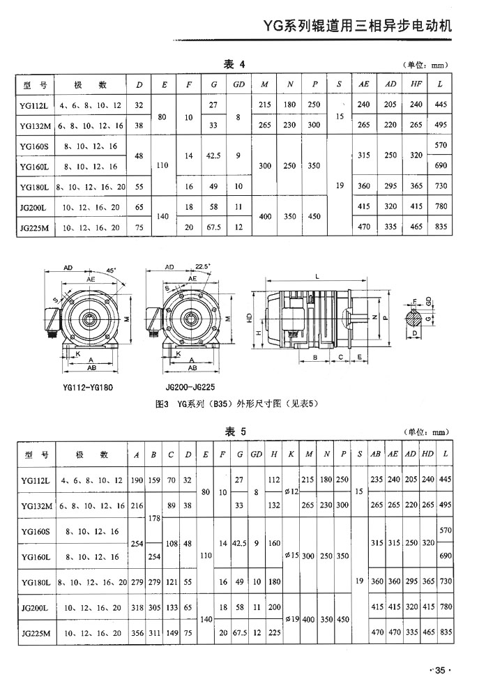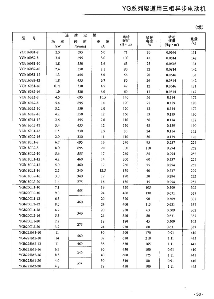 YG系列輥道用三相異步電動(dòng)機(jī)是在JG2系列的基礎(chǔ)上設(shè)計(jì)而成的新一代高可靠性輥道電動(dòng)機(jī)。該電動(dòng)機(jī)具有體積小、重量輕、性能好、使用可靠、維修方便等優(yōu)點(diǎn)。該系列電動(dòng)機(jī)能夠在頻繁啟動(dòng)、制動(dòng)、正反轉(zhuǎn)、反接制動(dòng)等沖擊性載荷和高溫、多灰塵環(huán)境的惡劣條件下連續(xù)或斷續(xù)工作,具有較高的過(guò)載能力,為鋼廠工作輥道和輸送的專用電動(dòng)機(jī),也可以應(yīng)用于其它的機(jī)械設(shè)備上。 電動(dòng)機(jī)按用途可分為YGa、YGb兩種型式。YGa型電動(dòng)機(jī)具有堵轉(zhuǎn)轉(zhuǎn)矩大、動(dòng)態(tài)常數(shù)高、機(jī)械特性軟的特點(diǎn),能頻繁啟動(dòng)、制動(dòng)和反轉(zhuǎn)運(yùn)行,適用于單獨(dú)拖動(dòng)冶金工業(yè)的工作輥道輥?zhàn)印Gb型電動(dòng)機(jī)具有功率大、效率高、機(jī)械特性硬的特點(diǎn)。通常只有單向運(yùn)轉(zhuǎn),適用于單獨(dú)拖動(dòng)冶金工業(yè)的傳送輥道輥?zhàn)印?電動(dòng)機(jī)額定電壓380V、額定頻率50Hz,電動(dòng)機(jī)采用Y形聯(lián)結(jié),可以滿壓?jiǎn)?dòng)。在保持電壓與頻率成正比變化的條件下,YGa型電動(dòng)機(jī)允許在20~80Hz頻率范圍內(nèi)使用(但堵轉(zhuǎn)轉(zhuǎn)矩和動(dòng)態(tài)常數(shù)隨頻率的變化而變化);YGb型電動(dòng)機(jī)可在5~80Hz頻率范圍內(nèi)運(yùn)行。 YGa型電動(dòng)機(jī)主要用于斷續(xù)工作制,負(fù)載持續(xù)率以Fc表示:分別為15%、25%、40%、60%四種,其中40%為基準(zhǔn)定額。 YGb型電動(dòng)機(jī)主要用于連續(xù)工作制。主要規(guī)格:YGa112、YGa132、YGa160、YGa180、YGa200、YGa225、YGb112、YGb132、YGb160、YGb200、YGb225
